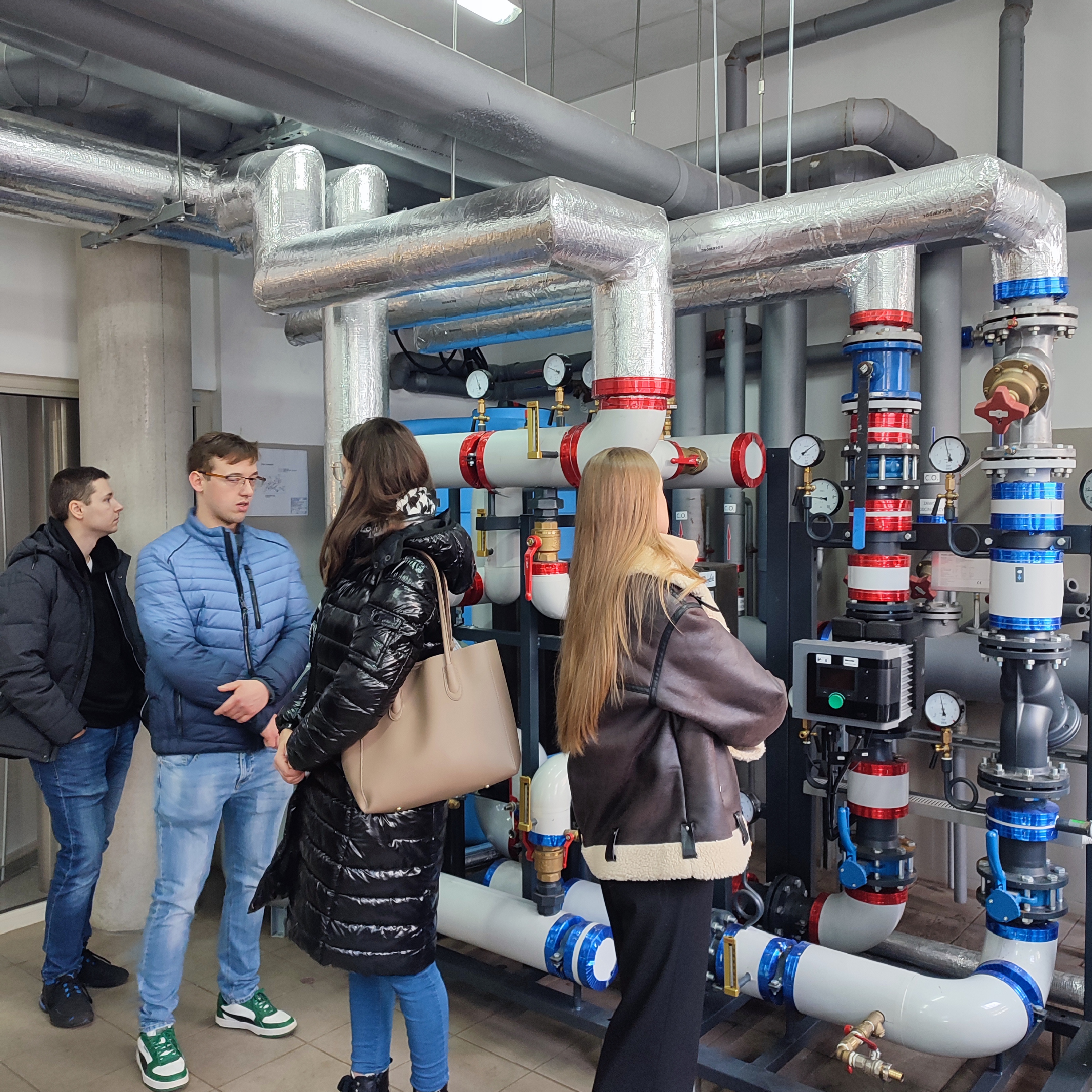 W dniu 28.01.2025 r. studenci II semestru II stopnia studiów stacjonarnych kierunku Inżynieria Środowiska uczestniczyli w wycieczce dydaktycznej, której celem było zwiedzanie węzłów cieplnych zlokalizowanych na terenie kampusu Uniwersytetu w Białymstoku. W małym gronie, ale prawie ze 100% frekwencją studenci specjalności: Ogrzewnictwo i Wentylacja mieli okazję przyjrzeć się węzłom cieplnym pracującym na cele grzewcze, wentylacyjne, zasilania w ciepło technologiczne oraz podgrzewu ciepłej wody użytkowej. Zaczęliśmy od wizyty na Wydziale Biologii, gdzie zapoznaliśmy się z układem technologicznym i działaniem węzła o łącznej mocy 0,9 MW. Następnie odwiedziliśmy Wydział Matematyki, w którym znajdował się inny węzeł o łącznej mocy 0,5 MW, a na zakończenie naszej wycieczki dydaktycznej zapoznaliśmy się z funkcjonowaniem węzła w budynku Biblioteki UB, o mocy 0,469 MW.