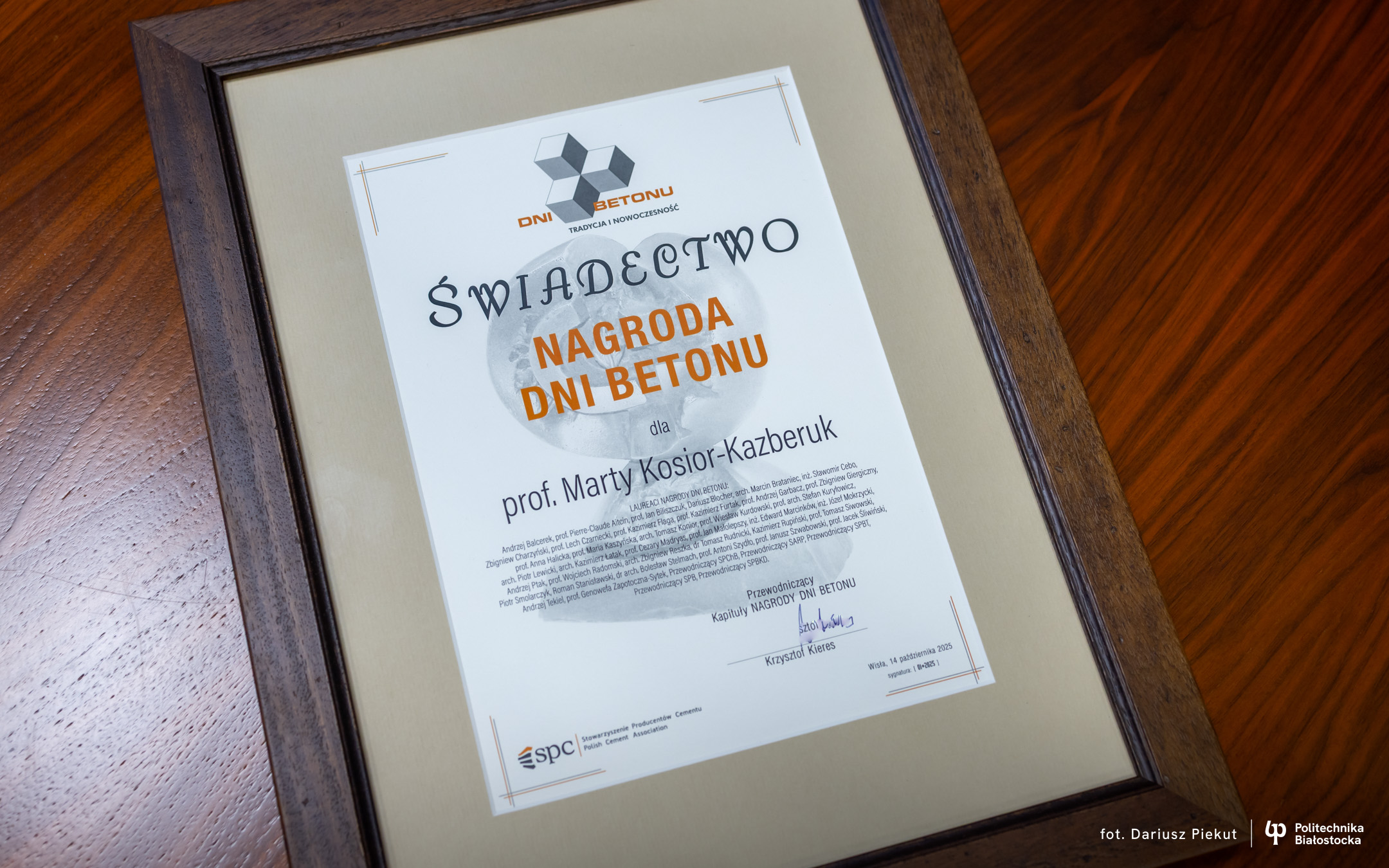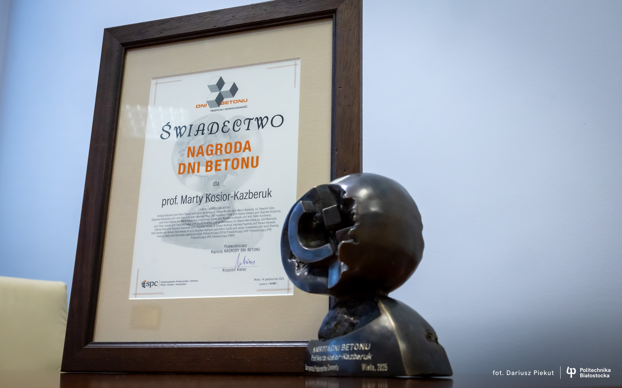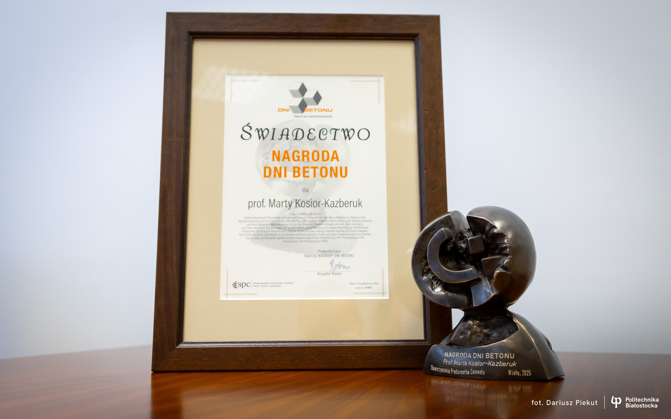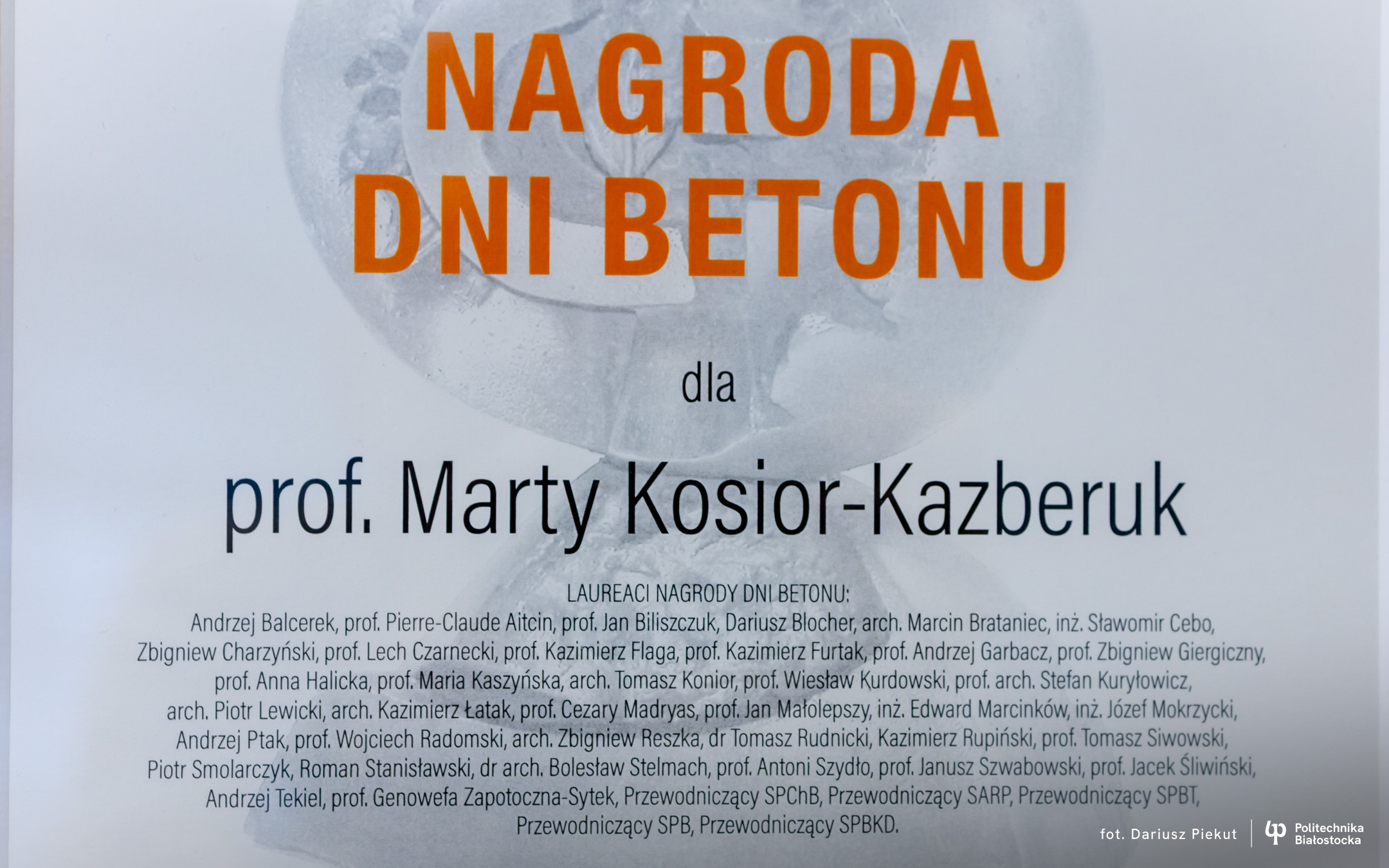 Podczas konferencji branżowej Dni Betonu dr hab. inż. Marta Kosior-Kazberuk, prof. PB, Rektor Politechniki Białostockiej odebrała tzw. „Betonowego Oskara”. To wyróżnienie przyznawane osobom i instytucjom o znaczącym dorobku w zakresie technologii betonu, zarówno w obszarze nauki, jak i rzeczywistych realizacji obiektów budowlanych.