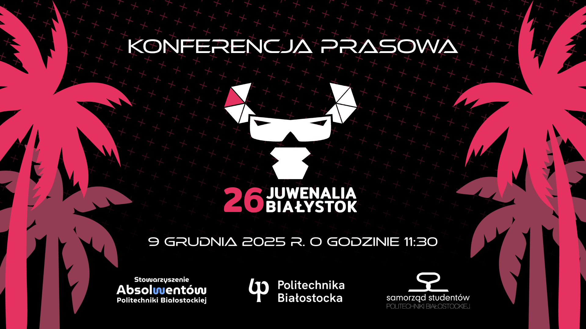 Po raz kolejny spotkamy się na Kampusie Politechniki Białostockiej podczas Dni Kultury Studenckiej Juwenalia Białystok 2026! Organizatorzy kolejnej edycji – Samorząd Studentów Politechniki Białostockiej wraz ze Stowarzyszeniem Absolwentów Politechniki Białostockiej poinformują o zmianach i nowościach podczas konferencji prasowej 9 grudnia 2025 roku o godz. 11:30 w Centrum Nowoczesnego Kształcenia Politechniki Białostockiej.