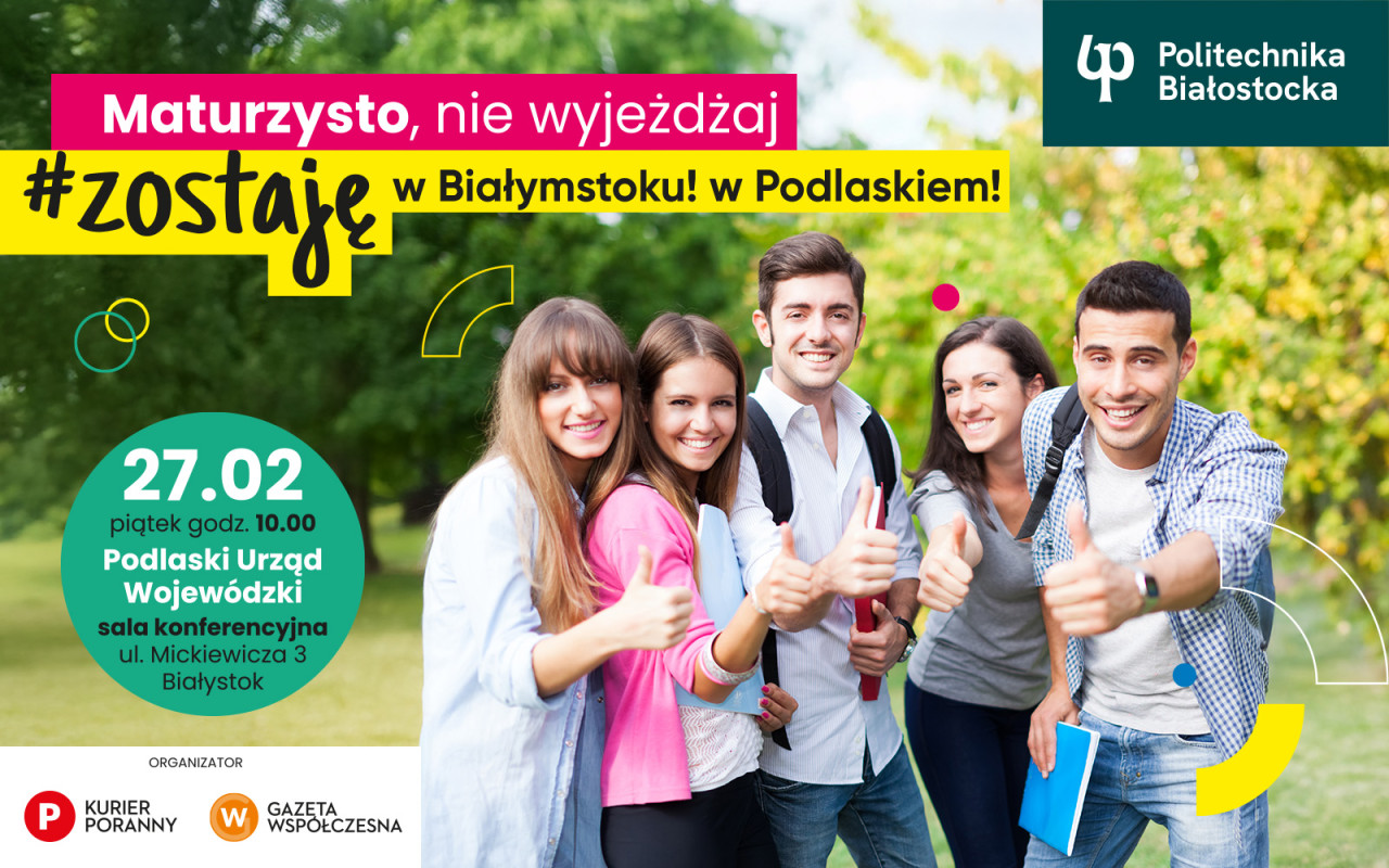 Politechnika Białostocka spotka się z maturzystami w ramach akcji „Zostaję w Białymstoku, zostaję w Podlaskiem” 27 lutego 2026 r. w Podlaskim Urzędzie Wojewódzkim. Uczelnia zaprezentuje kierunki studiów, zachęcając młodzież do wyboru zawodu inżyniera i weźmie udział w panelu poświęconym edukacji.