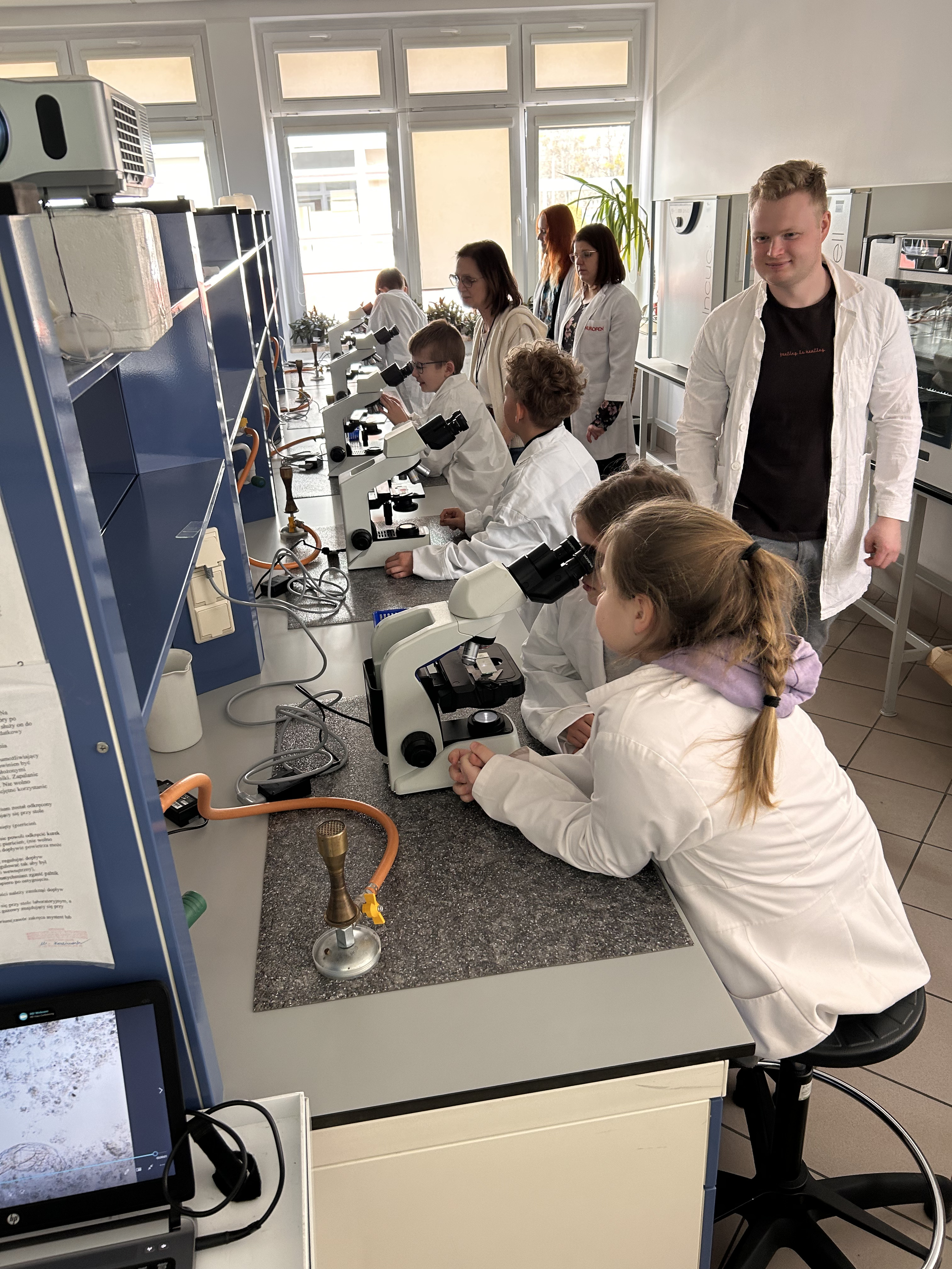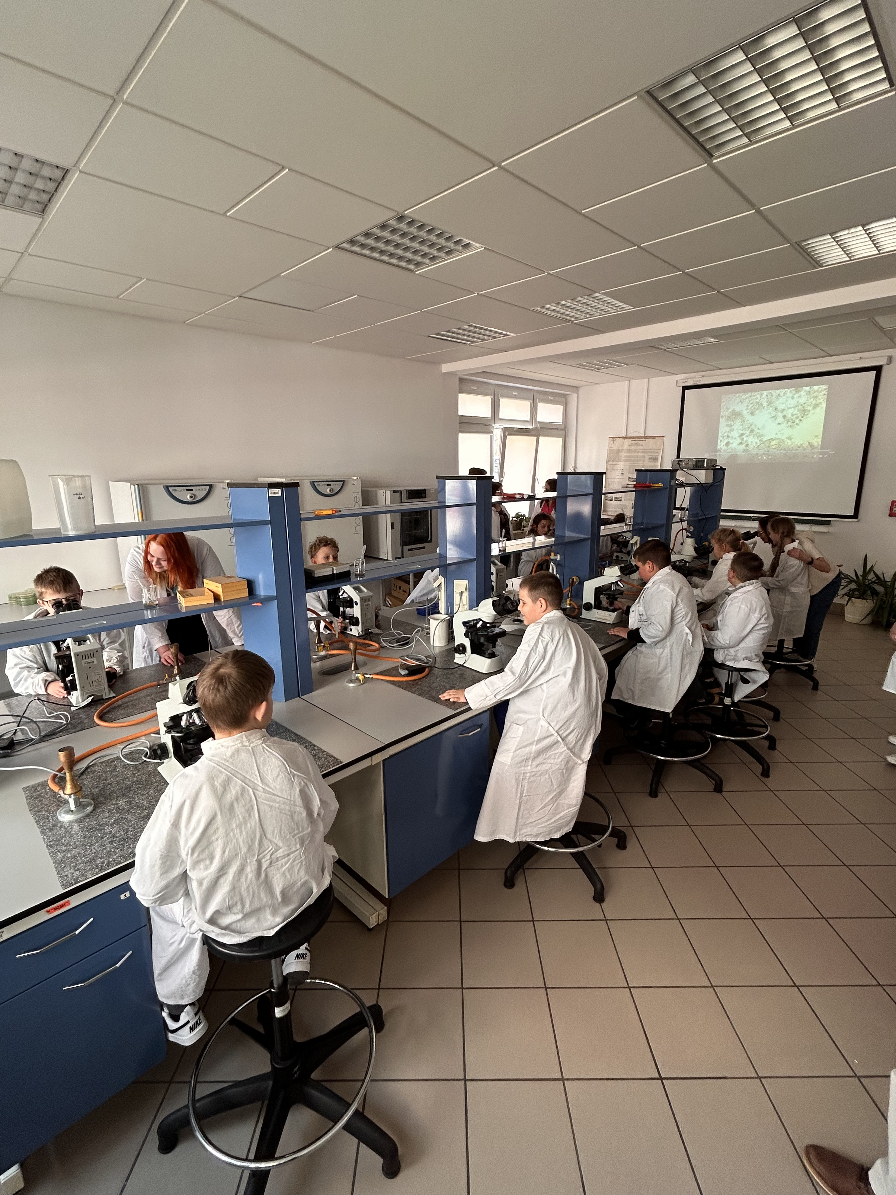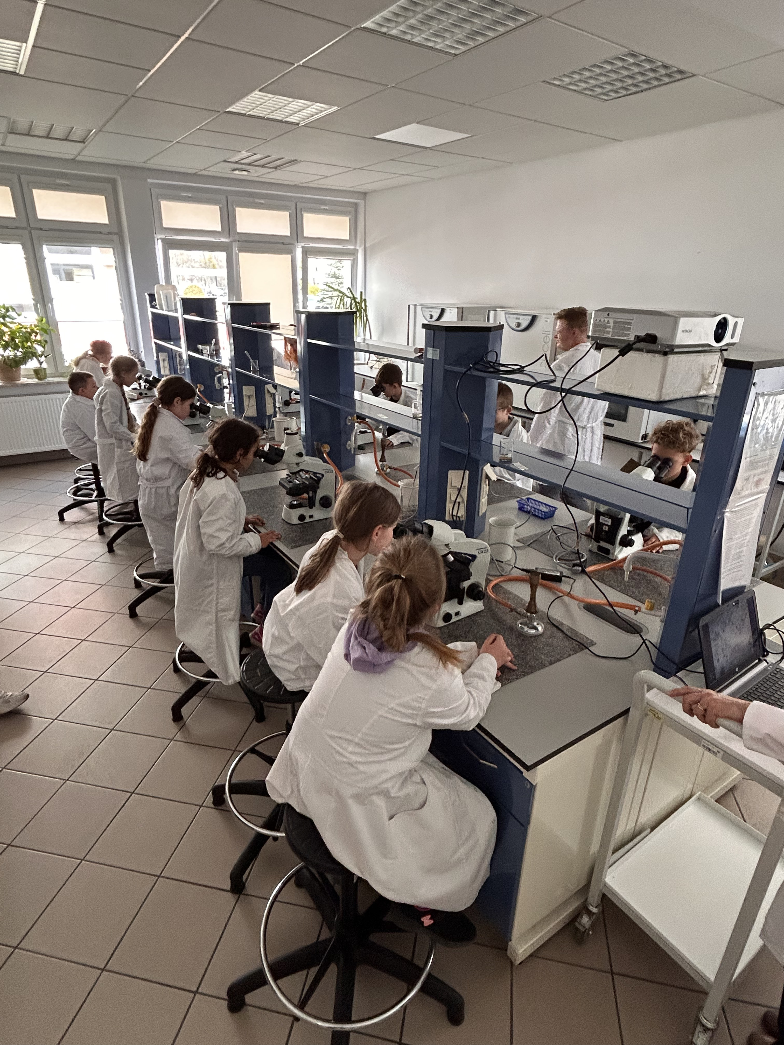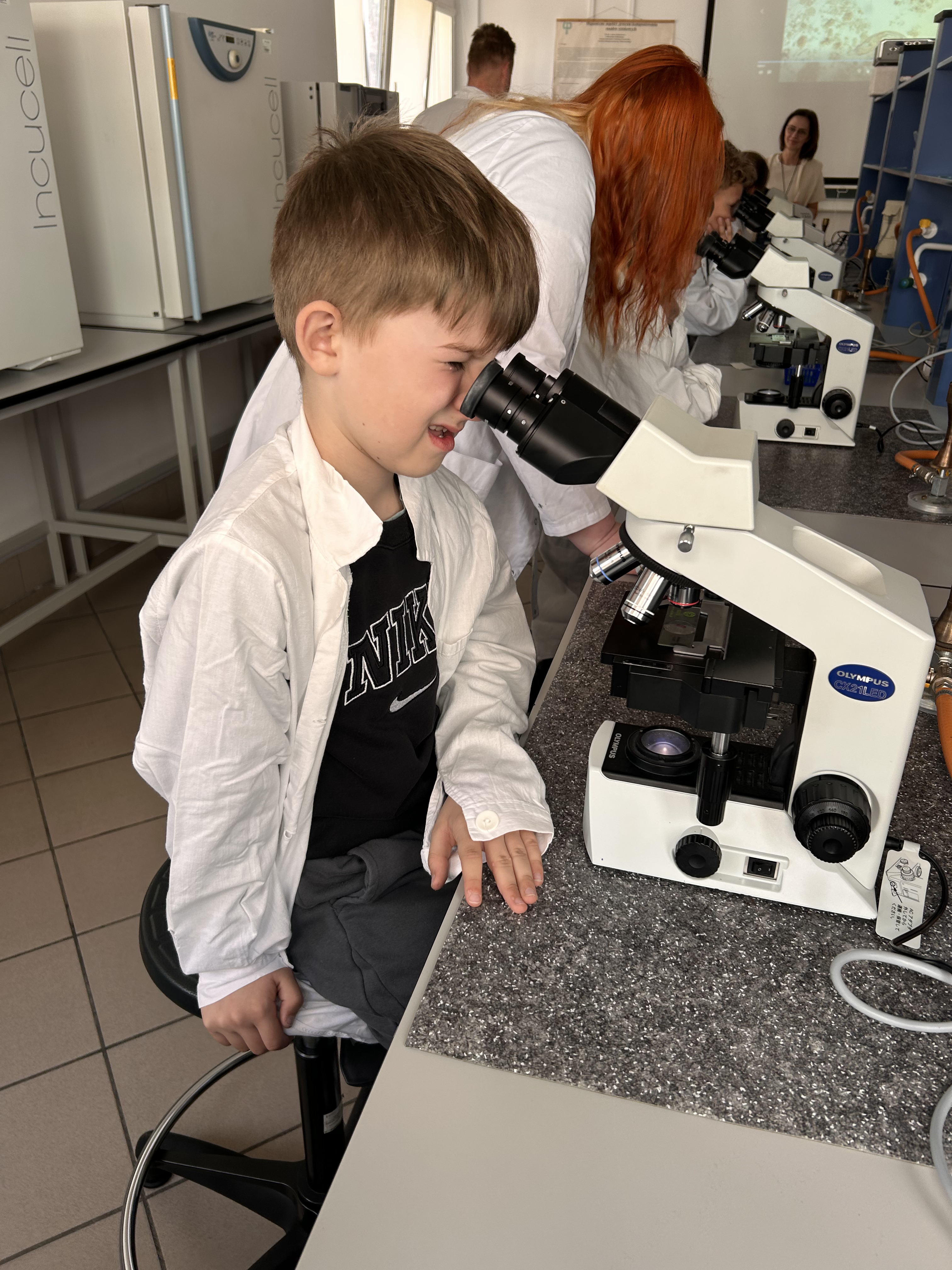 Dodatkowo najmłodsi mieli okazję zajrzeć do fascynującego świata mikroorganizmów. Dzięki analizie mikroskopowej poznali „ukryte życie” w kropli wody – od drobnych organizmów żyjących w akwarium, po obserwację gotowych preparatów mikroskopowych. Zajęcia pozwoliły im zobaczyć, jak różnorodny i aktywny jest mikroświat, który na co dzień pozostaje niewidoczny gołym okiem.