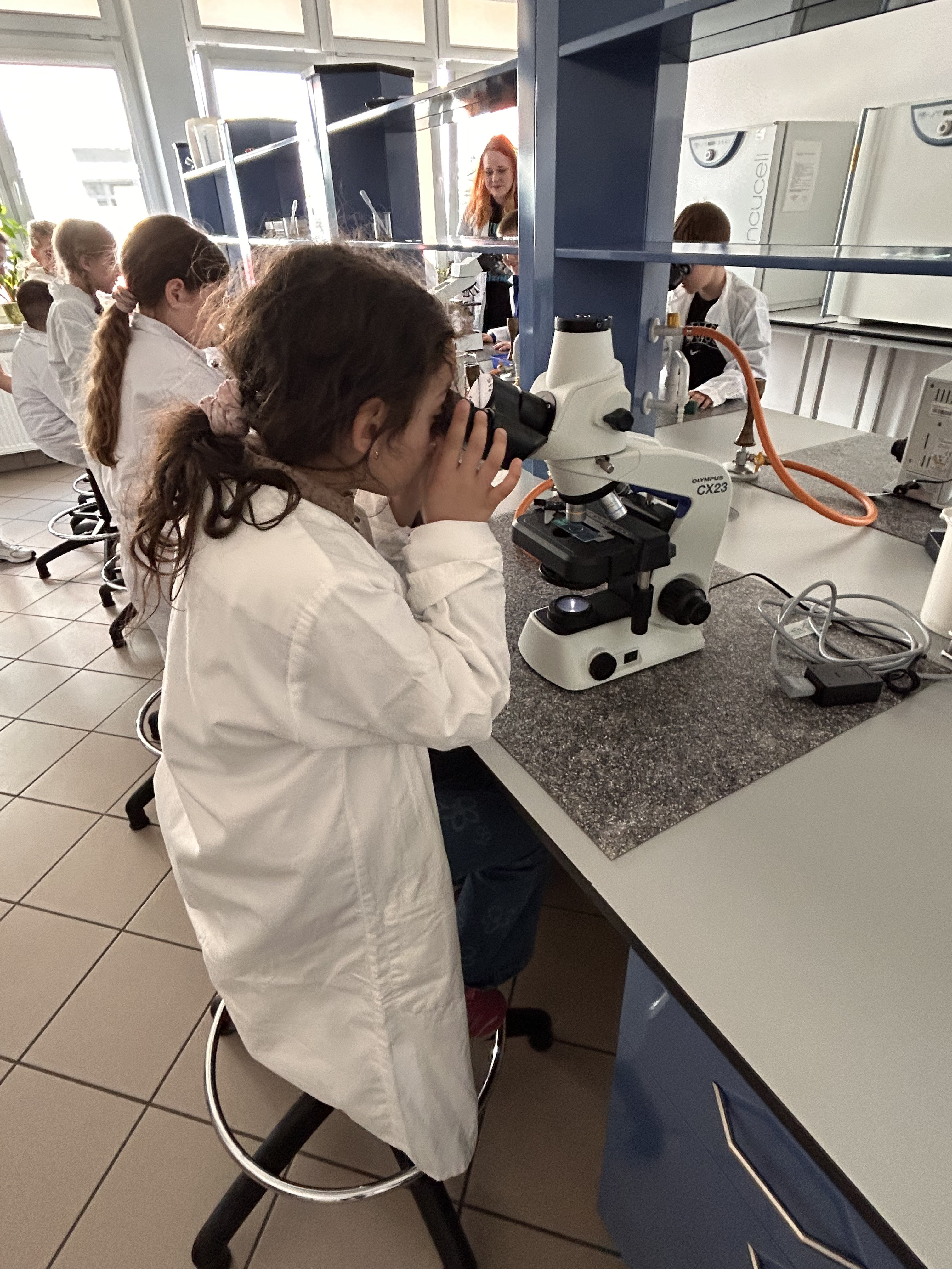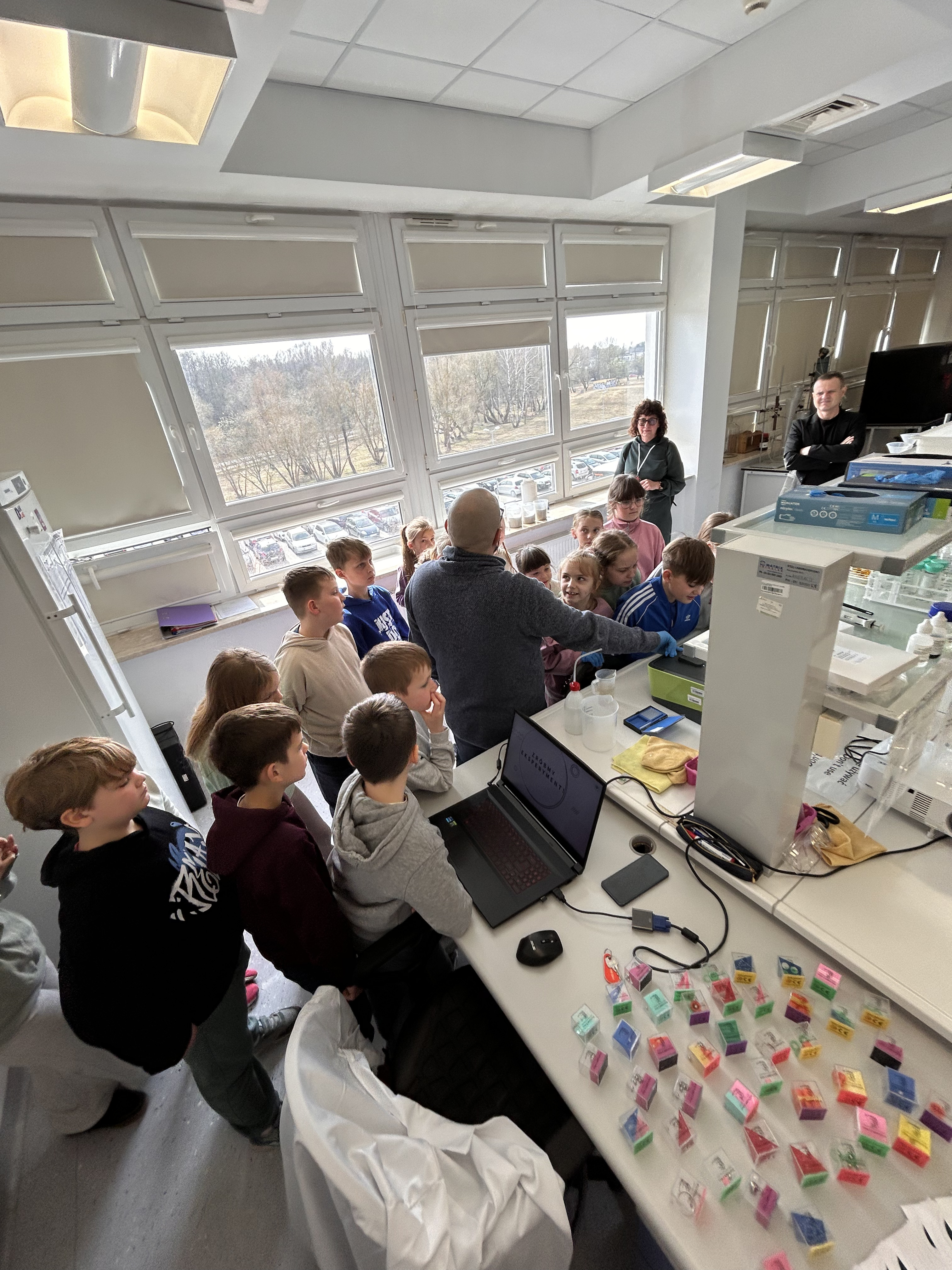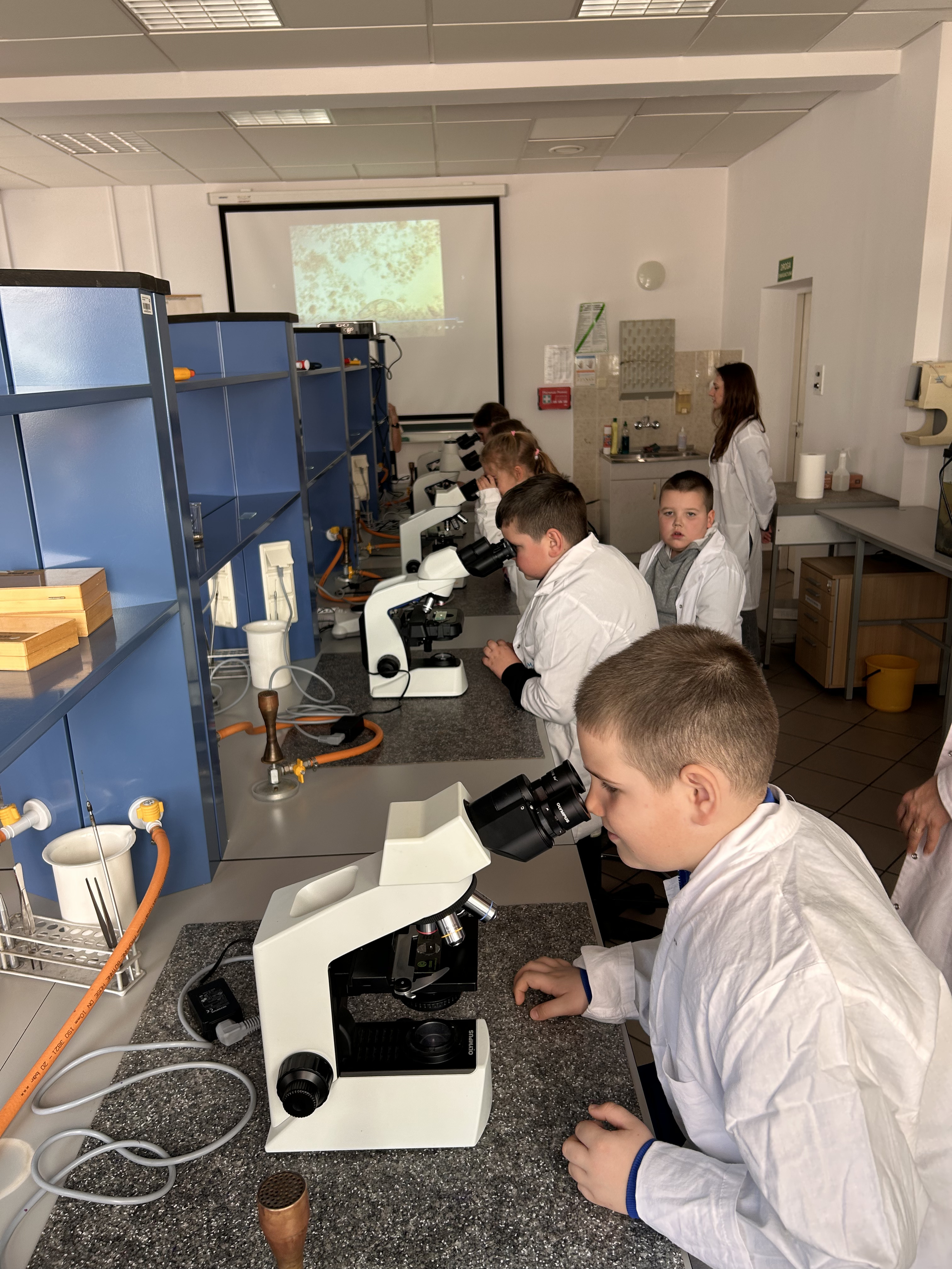 Dodatkowo najmłodsi mieli okazję zajrzeć do fascynującego świata mikroorganizmów. Dzięki analizie mikroskopowej poznali „ukryte życie” w kropli wody – od drobnych organizmów żyjących w akwarium, po obserwację gotowych preparatów mikroskopowych. Zajęcia pozwoliły im zobaczyć, jak różnorodny i aktywny jest mikroświat, który na co dzień pozostaje niewidoczny gołym okiem.