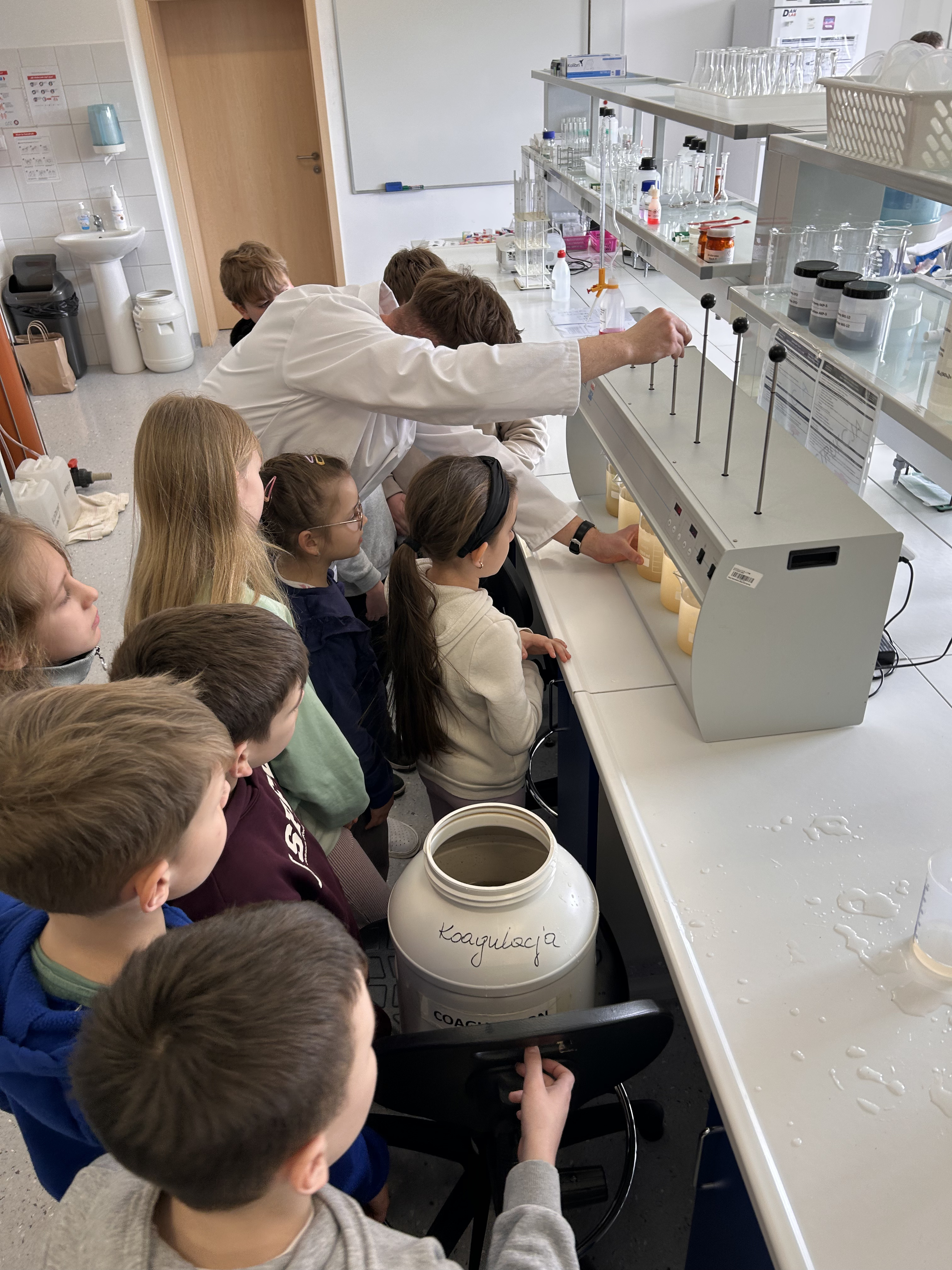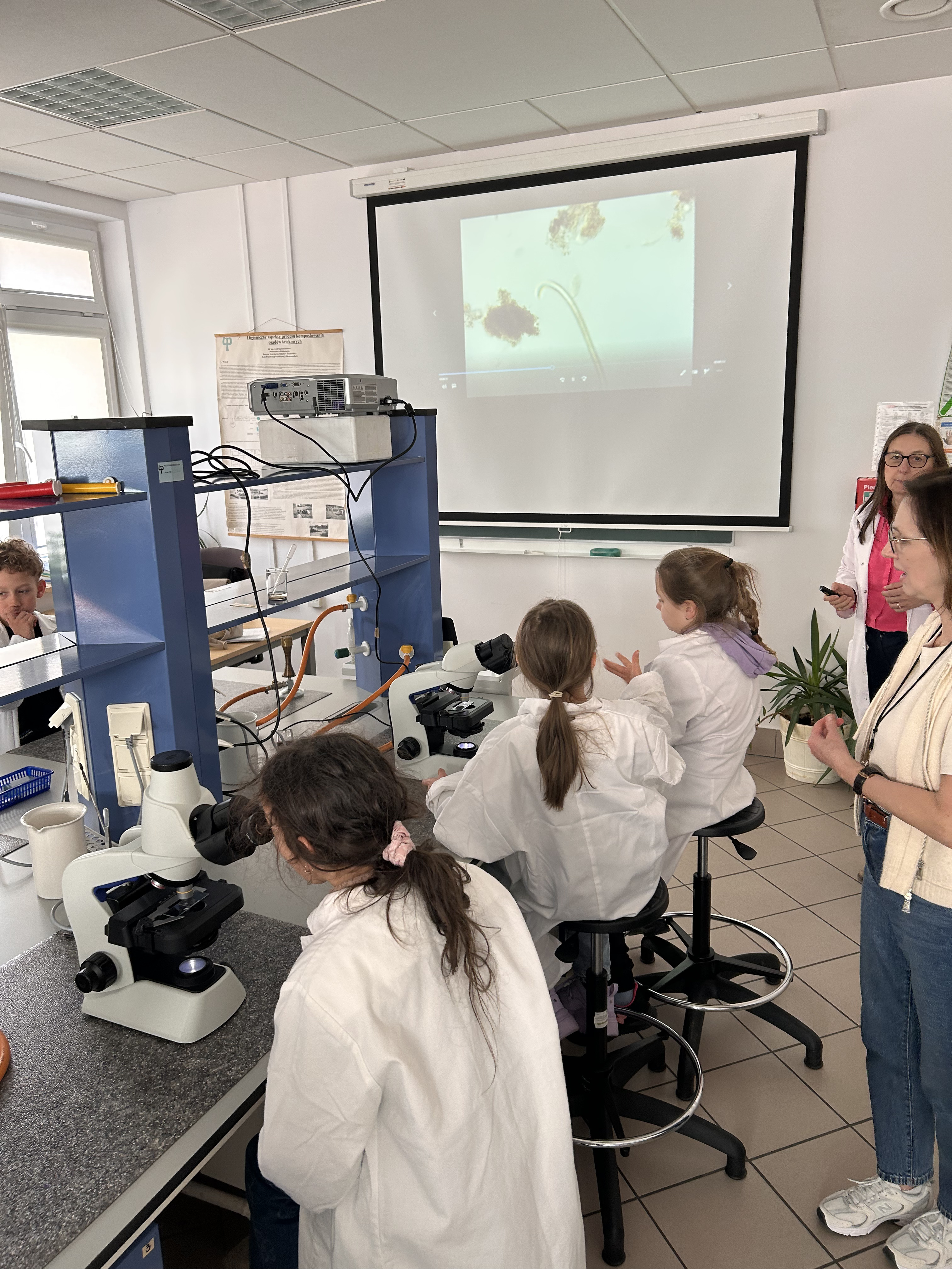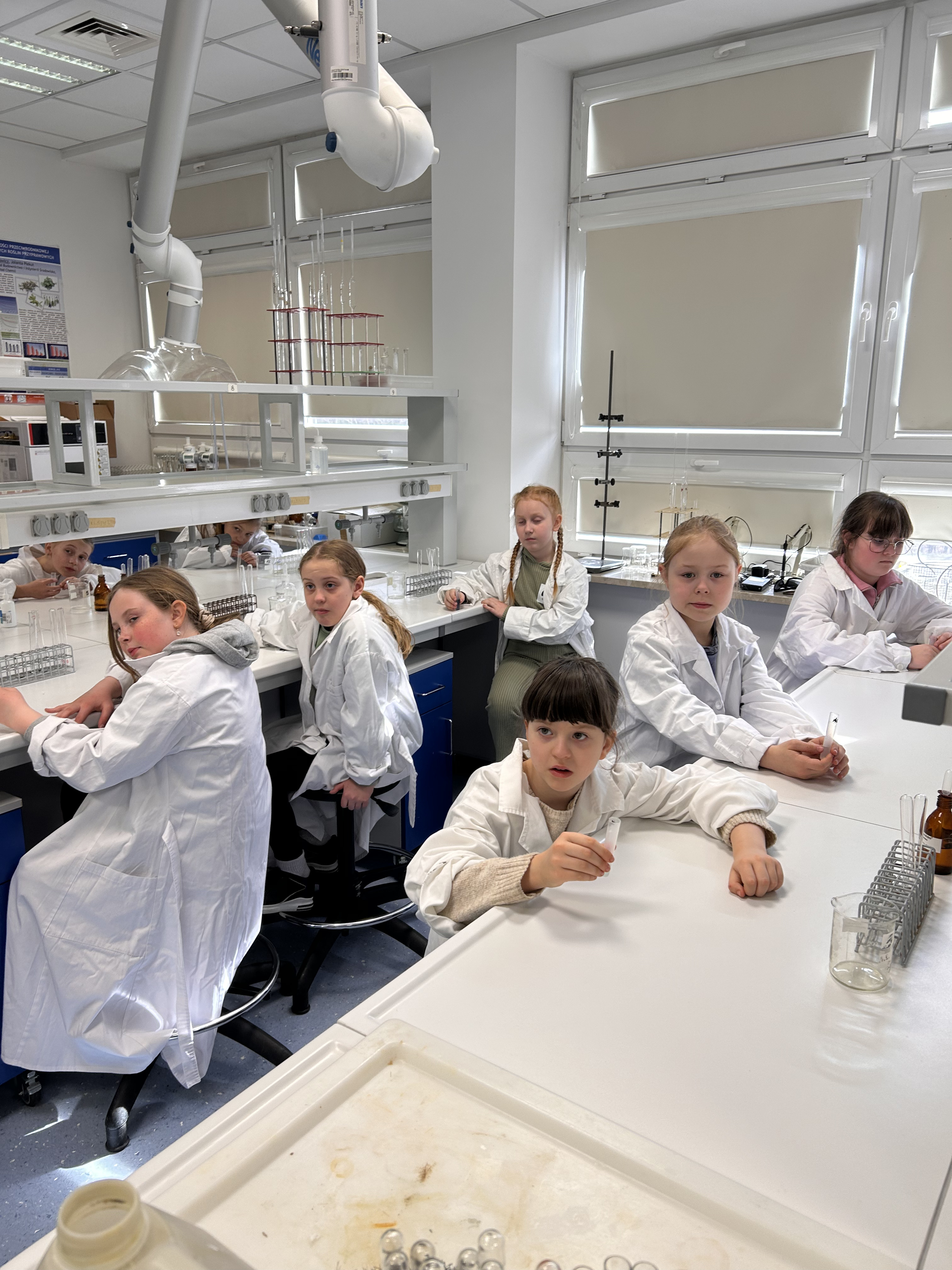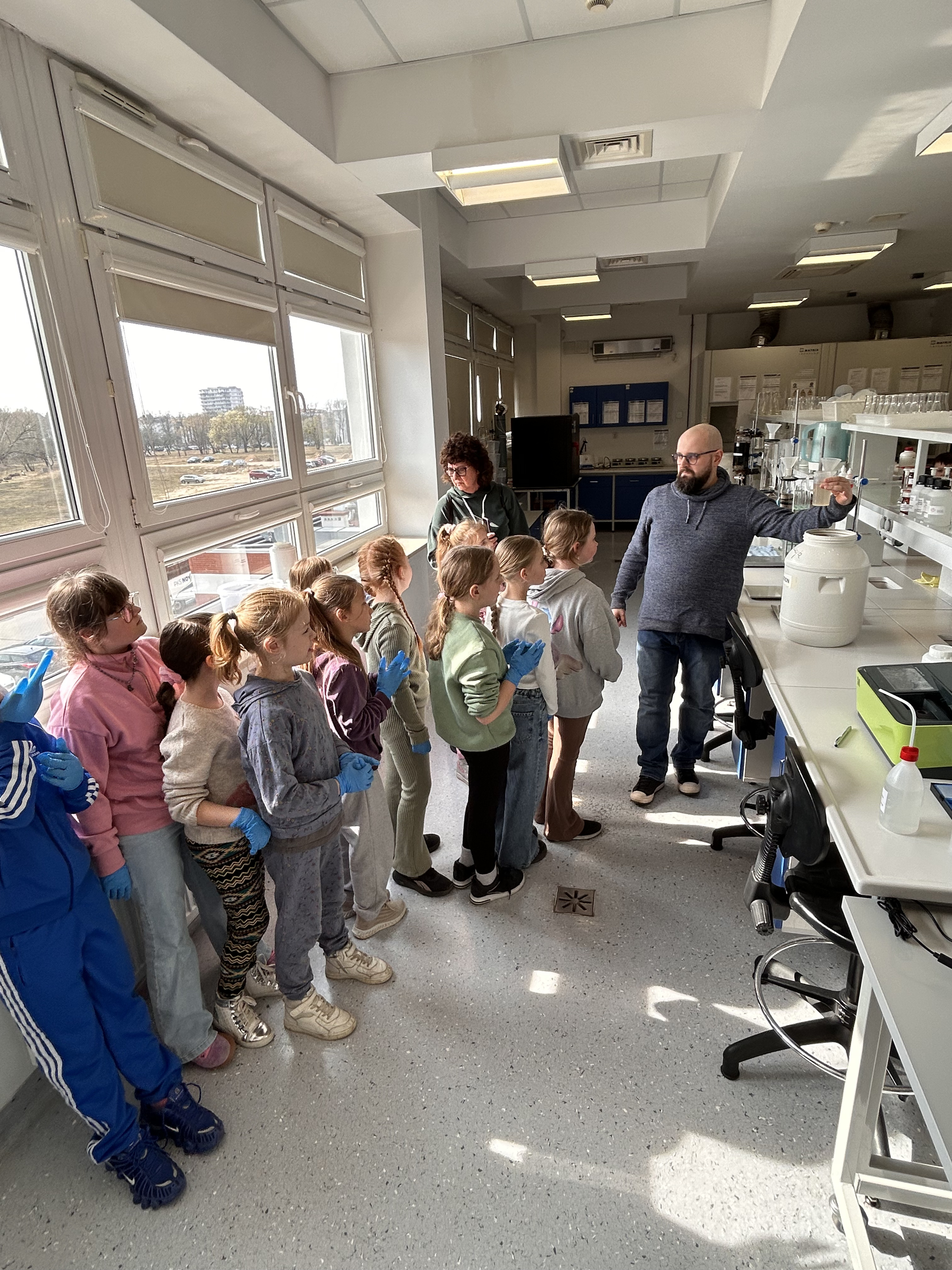 Dodatkowo najmłodsi mieli okazję zajrzeć do fascynującego świata mikroorganizmów. Dzięki analizie mikroskopowej poznali „ukryte życie” w kropli wody – od drobnych organizmów żyjących w akwarium, po obserwację gotowych preparatów mikroskopowych. Zajęcia pozwoliły im zobaczyć, jak różnorodny i aktywny jest mikroświat, który na co dzień pozostaje niewidoczny gołym okiem.